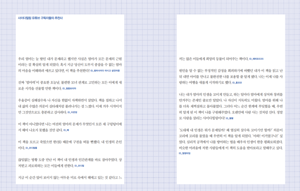 시안을 받고, 바로 여러분들께서 보내주신 추천사의 모습을 공유하고자 글을 남깁니다 ^^