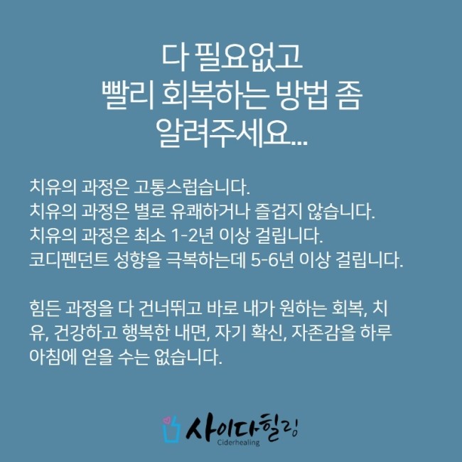 고되고 길고 지루한 치유의 여정을 꼭 혼자서 다 해낼 필요는 없습니다. 필요한 상담사, 멘토를 만나시고 또 함께 걸어갈 동지들을 만나세요 ^^