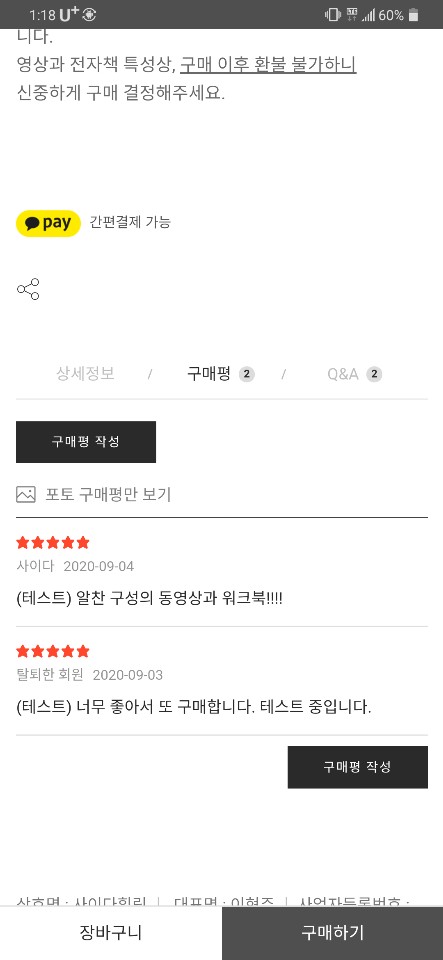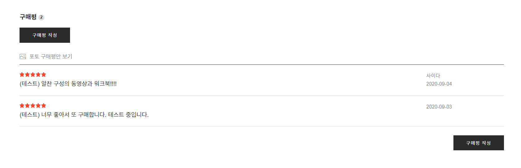 사이트에서 상품 구입 페이지를 클릭하시면 <구매평>을 보거나 남기실 수 있습니다.