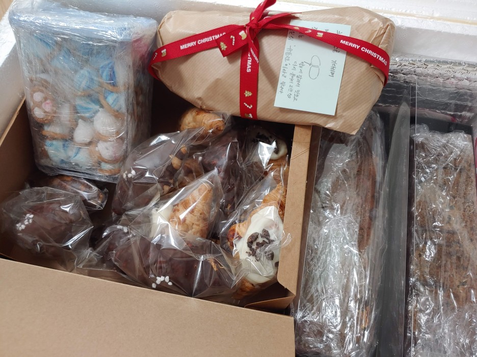 정유경 작가님께서 직접 구우신 바나나 브레드, 머랭 쿠키, 크로아상... 슈톨렌도 구입해서 보내주셨어요. 슈톨렌은 크리스마스를 기다리며 조금씩 아껴먹는 거라고 했는데 그 전에 다 먹었네요 ^^