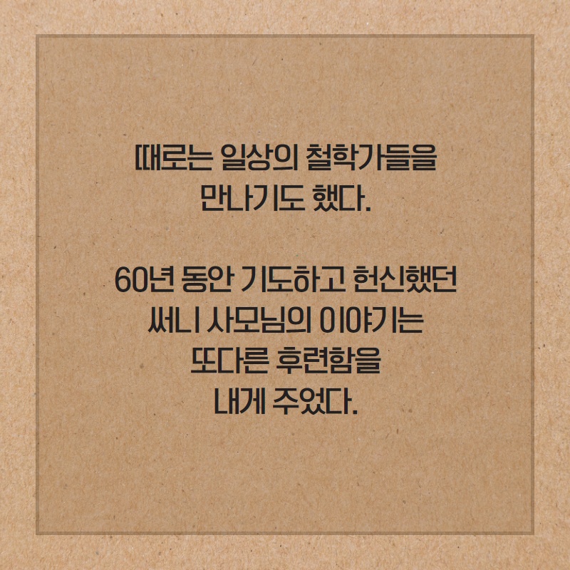 물론, 나의 생각과 100% 다 일치한다고 말할 수는 없다. 하지만 경험과 심정, 그리고 어떻게 살아갈 것인가.. 그 내용은 나와 놀라울 정도로 공통점이 많았다. 우리는 분명 다른 세대이지만 대화가 잘 통하는 정말 멋진 사모님이다.