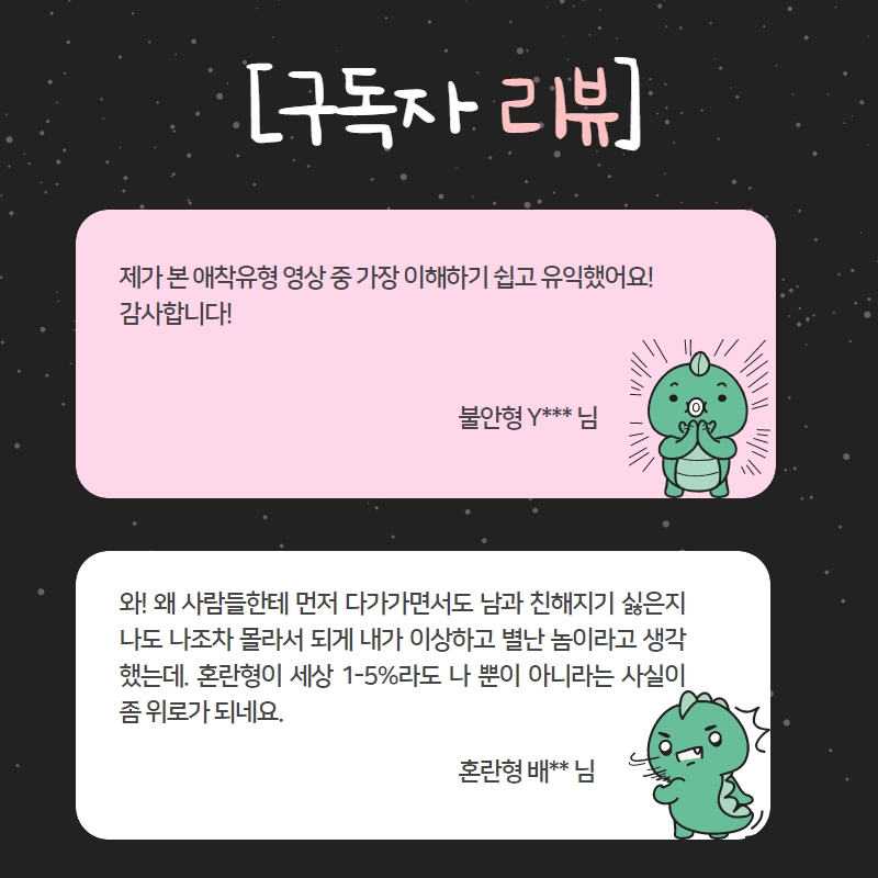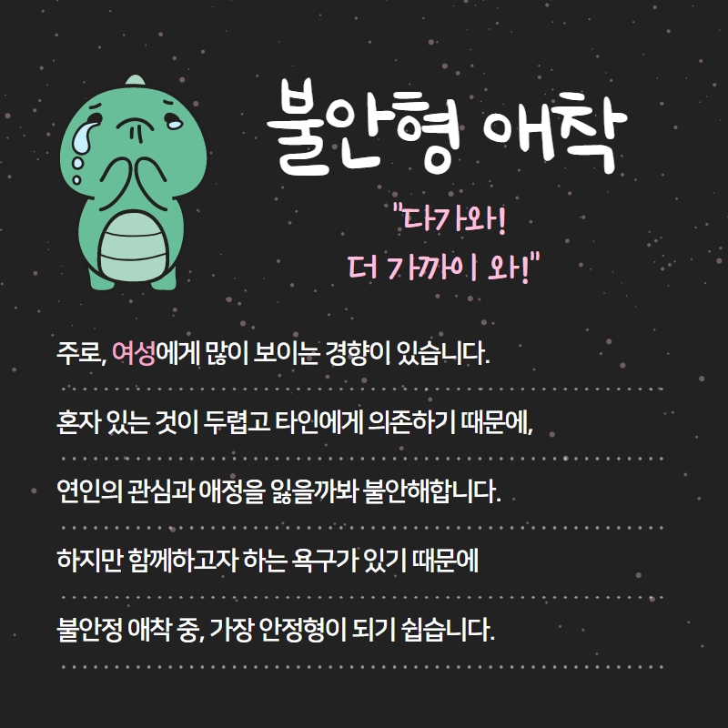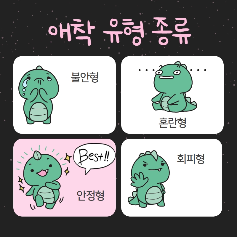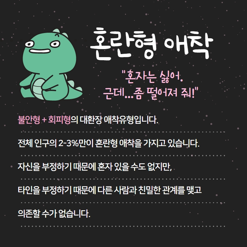 하지만 '혼란형' 애착유형에 대해 더 자세하게 알고 싶은 분이나 애착유형으로 인해서 잘못된 연애 패턴이 반복되시는 분은 아래 내용 한 번 봐주세요 ^^