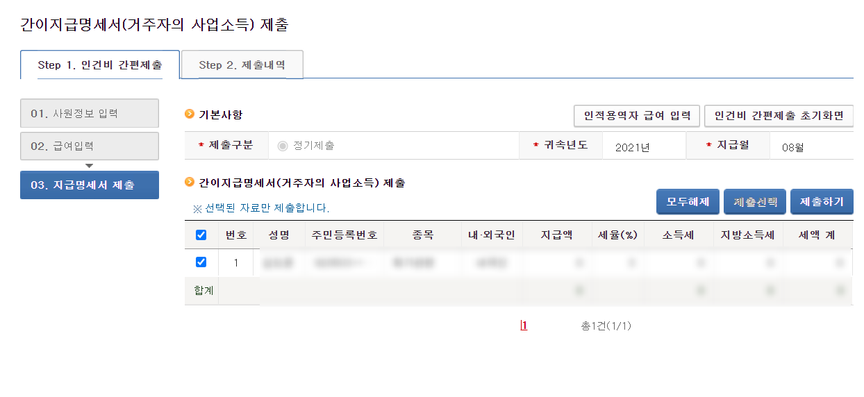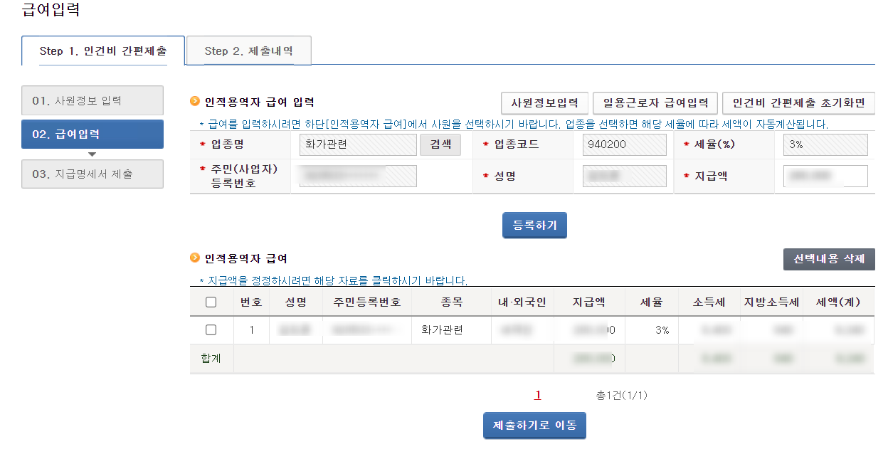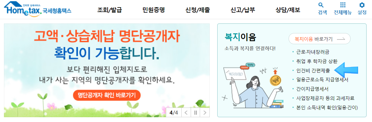 (또는 신청/제출 > 과세자료 제출 > 인건비간편제출)