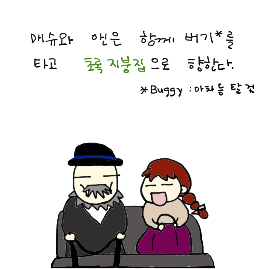 매슈는 앤의 이야기를 잘 들어주는 유일한 성인이었다. 초록색 지붕집에 오기 전까지 앤은 함께 사는 성인들에게 노동력에 불과하였고, 어울릴 또래도 마땅치 않았던 앤은 혼잣말에 익숙해져있었다. 더군다나 시대 상, 아이들의 이야기를 어른이 주의깊게 들어줄리도 만무할 것이다. 하지만 매슈는 억지로 들어준 것이 아니라 앤의 상상이나 끝없는 수다를 무척 즐거워하기까지 했다. 한 사람이라도 편견없이 진지하게 내 이야기에 귀를 기울여줄 수 있다는 것이 얼마나 큰 행복인가? 그런 면에서 마음껏 말해도 괜찮고, 틀려도 괜찮다고 지지해주는 매슈를 곁에 두고 있는 앤이 늘 부럽다.