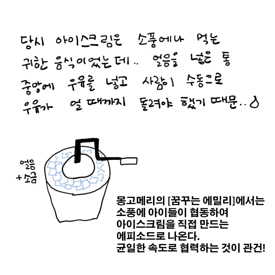 아이들에게 아이스크림을 먹을 수 있는 기회는 둘 뿐이다. 하나는 일 년에 한 번 열리는 주일학교 봄소풍에 참가하는 것이다. 통의 가장자리에 얼음을 채우고 우유를 넣고 열심히 돌리면 우유가 부드럽게 얼면서 아이스크림이 된다. 평송는 이 통도 구할 수 없고, 얼음을 구할 수도 없으므로 프린스 에드워드 섬 아이들에게 소풍은 매우 특별한 경험을 할 수 있는 날이 된다. 또 다른 한 가지 방법은 샬롯 타운의 식당에서 아이스크림을 먹는 것이다. 샬롯 타운에는 밤 11시에도 아이스크림을 먹을 수 있는 가게가 영업을 하고 있다. 이래나 저래나 아이스크림은 참 귀한 음식이다. 태어나 난생 처음 아이스크림을 먹어본 앤은 그 맛을 '천상의 맛'이라 표현한다.
