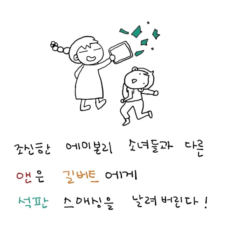 요즘 버전이라면 아이패드로 때려서 액정이 깨졌으려나? 혹은 아이패드는 너무 비싼 나머지 앤도 벌떡 일어섰다가도 차마 때리지 못하고 화를 속으로만 삭혔을지도 모르겠다.