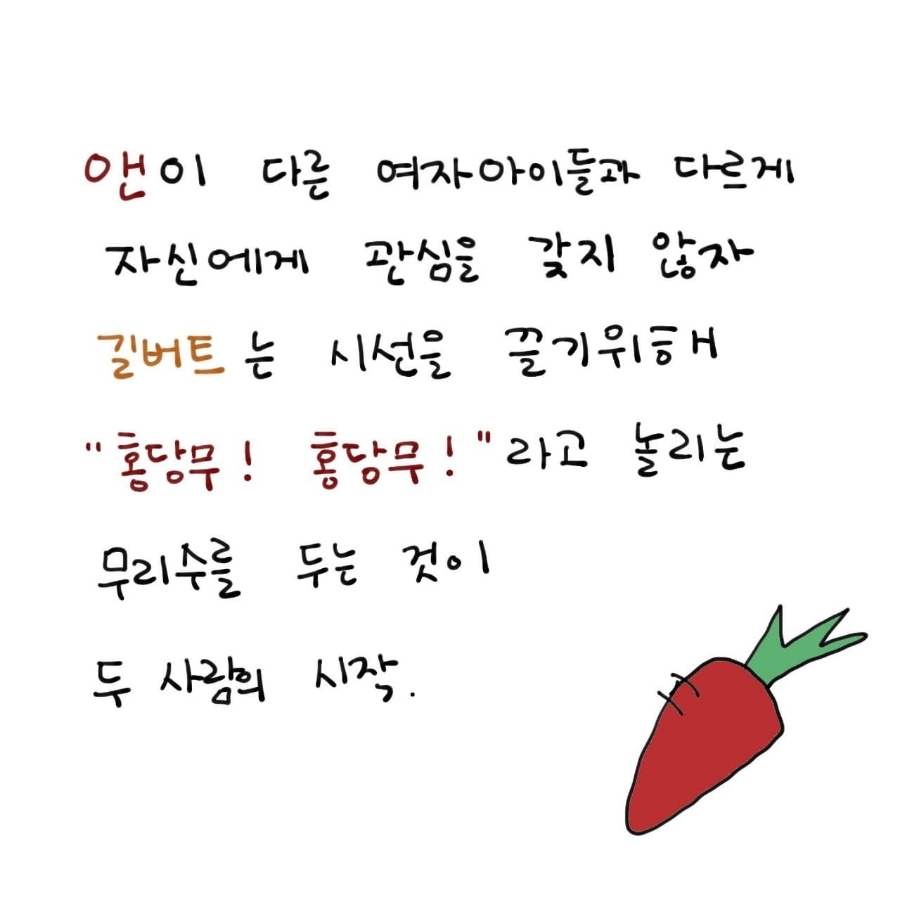 앤은 11살에 미래의 남편을 만난다. 철천지 원수로 말이다. 사건의 발달은 이러했다. 길버트는 매우 잘생기고 키가 큰 매력적인 남자아이였다. 길버트는 여자아이들의 시선을 받는 것에 익숙한데, 새로온 전학생 앤은 자신을 거들떠보지도않는 것이었다. 길버트는 앤에게 주의를 끌고자 노력해보지만 실패하게 되고, 무리수를 두게 된다. 바로 앤의 머릿카락 색깔을 두고 놀린 것이다. 사건은 홍당무라고 놀림을 받은 직후에 일어나는데 분노한 앤이 자리에서 벌떡 일어나 길버트의 머리를 석판으로 내리쳤다.