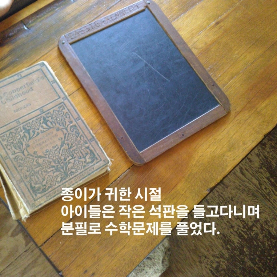 미국에서 살면서 개척 시대 관련한 박물관을 여러군데 다니게 되었고, 궁금하던 석판을 직접 볼 기회가 많았다. 당시의 석판은 학교에서 쓰던 칠판, 분필들과는 조금 달랐다. 글씨가 잘 써지지도 않고 보이지도 않아 도대체 이걸로 어떻게 수학문제를 풀지? 싶을 정도의 질이었다. 글씨를 쓴다기보다는 긁는다는 것이 맞지 않나 싶기도 했다. 어떻게 보면 당연한 것이지만 칠판의 질도 오랜 세월 동안 끊임없이 개발되고 발전되어온 것이다.