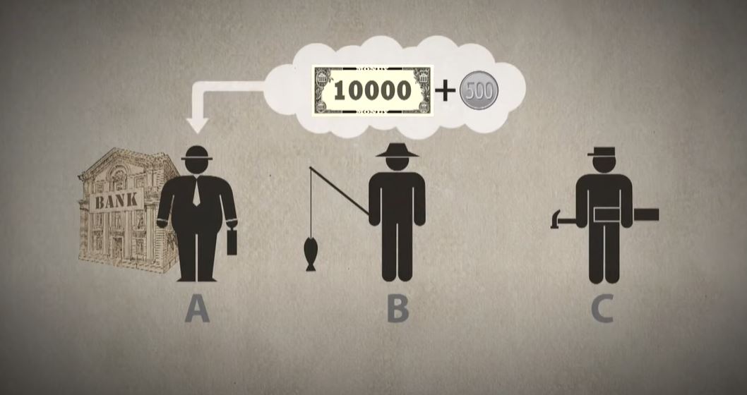 외부와 단절된 섬이 있다. 섬에는 중앙은행 A, 시민 B, 시민 C가 산다. 중앙은행 A가 발행한 돈은 1만 원 뿐이다. 시민 B가 증앙은행 A에 연이율 5%로 1만 원을 빌린다. 시민 B는 1년 뒤 1만 500원을 갚아야 한다. 시민 B는 1만 원을 갖고 시민 C에게 배를 사서 열심히 고기 잡는 일을 한다. 1년 뒤 시민 B는 중앙은행 A에게 1만 500원을 갚을 수 있을까?