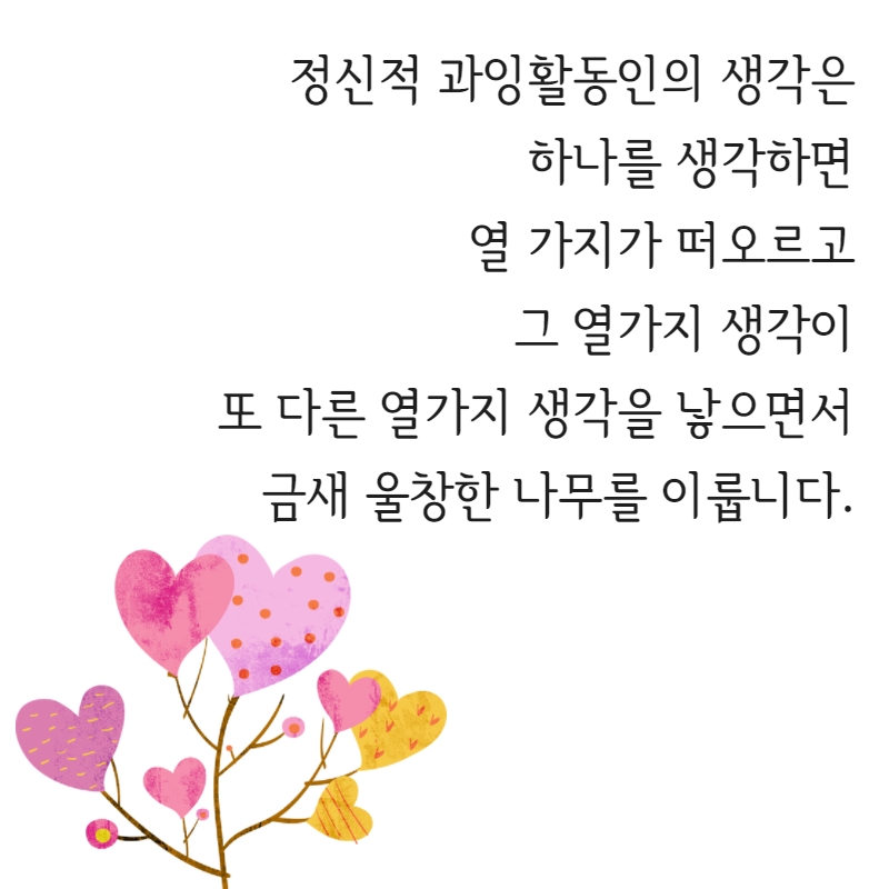정서적 과잉활동인의 생각은 나뭇가지처럼 여러 갈래로 풍성하게 뻗어 나갑니다. 정서적 과잉활동인의 사고는 저 혼자 여러 갈래로 마구 뻗어나가고 직접적 관련이 없는 문제까지 건드리며 끝없이 몽상을 부풀립니다.