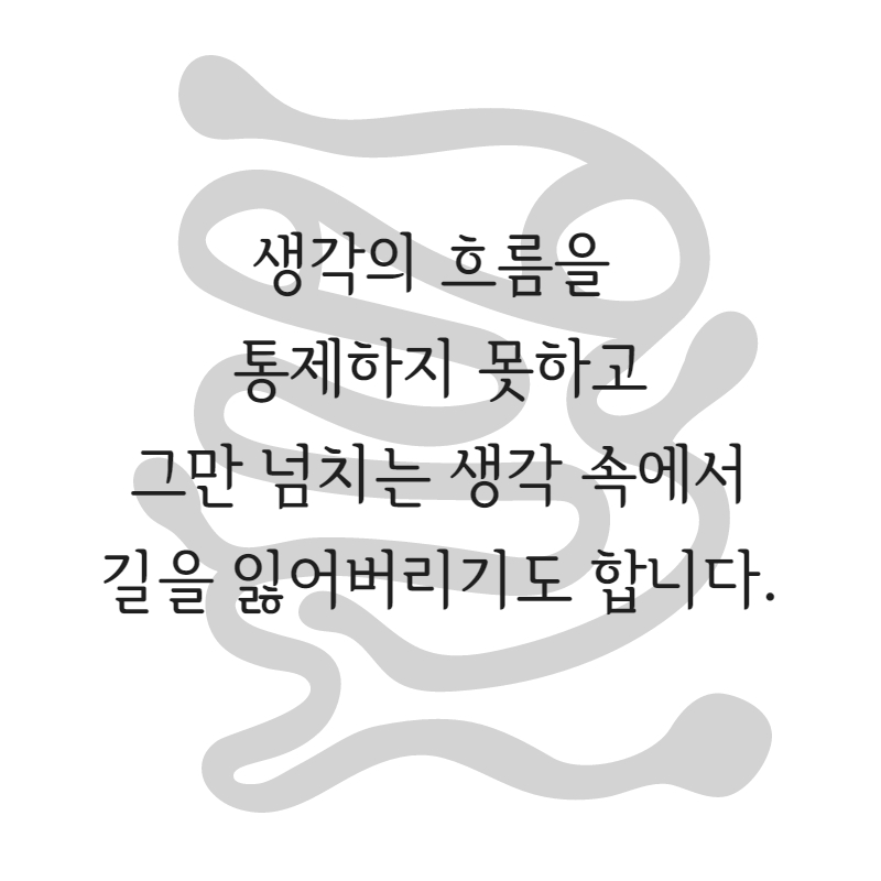 그렇다면 생각이 직선적으로 가는 것이 아니라 하나를 생각하면 열 가지가 떠오르고 그 열 가지 생각이 각기 또 다른 열 가지 생각을 낳으면서 금새 울창한 나무를 이루고, 스스로 생각의 흐름을 통제할 수 없는 정신적 과잉활동인들은 어떻게 해야할까요?