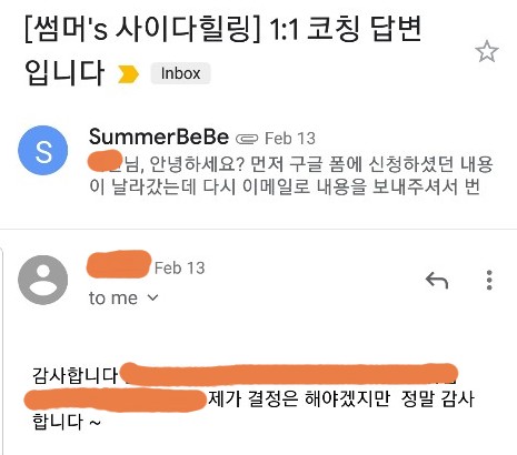 2월과 3월에 코칭 후 받은 메일 몇개를 개인 사연과 이름을 삭제하고 올려요.