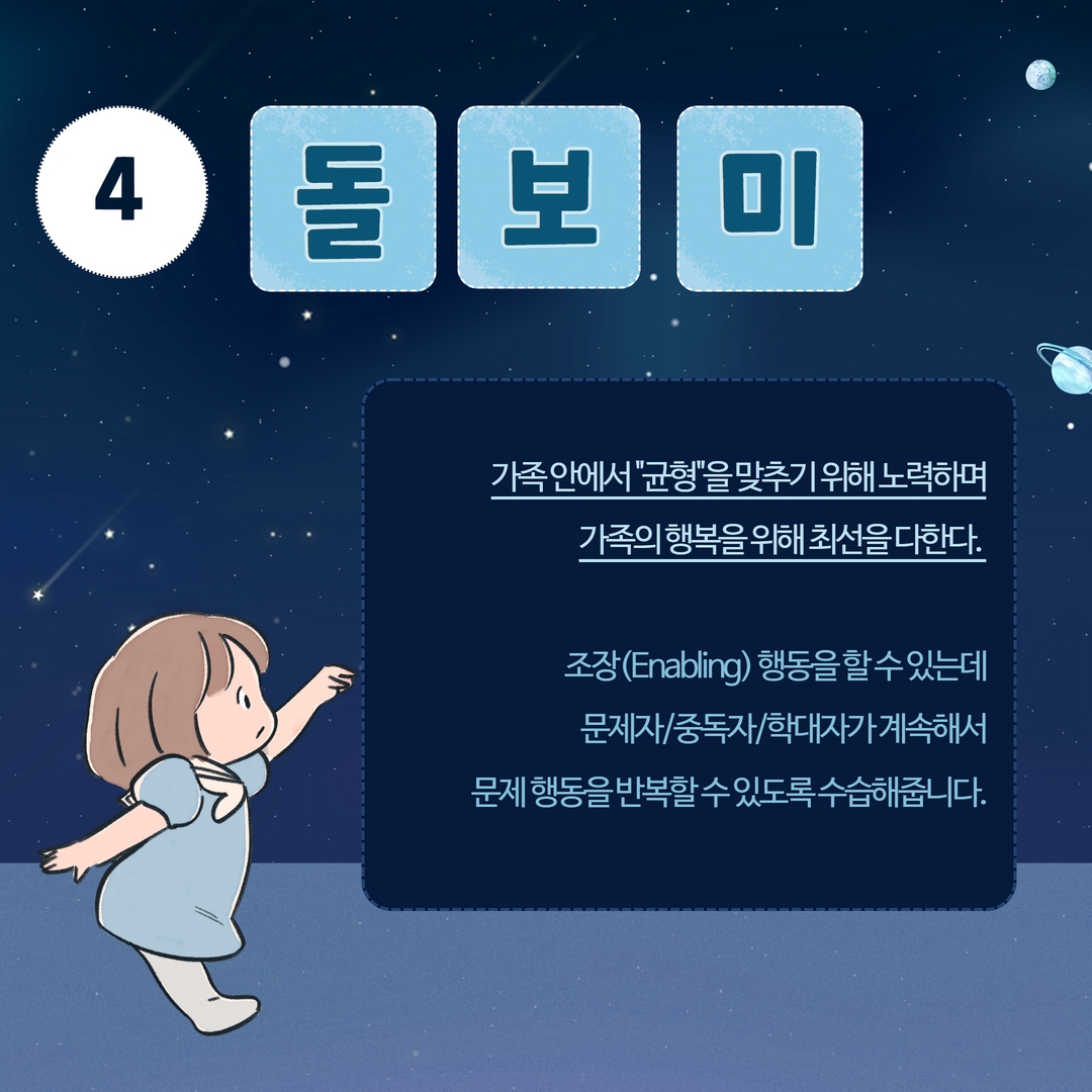 가족 중 가장 먼저 심리상담 등 외부의 도움을 먼저 찾음.